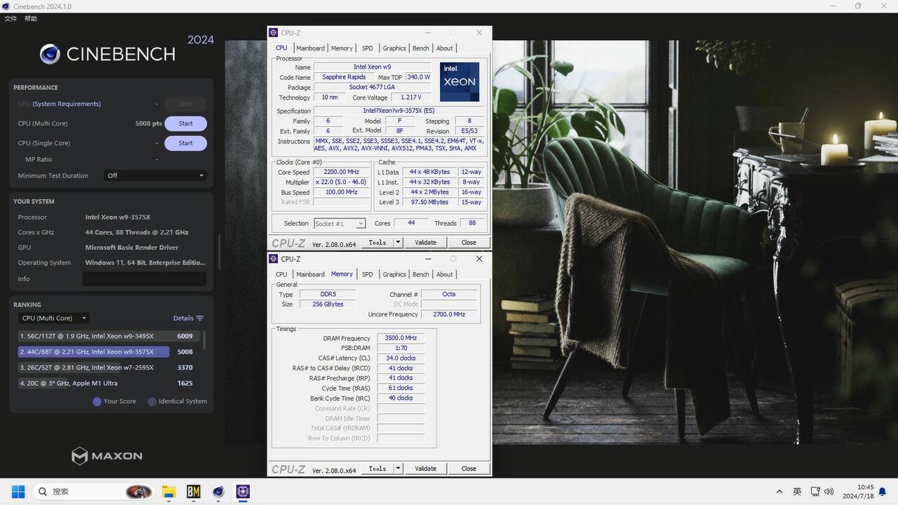 Im Cinebench 2024-Test erzielte die W9-3575X CPU 5.008 Punkte und belegte damit Platz 10 in der Gesamtwertung und den ersten Platz in der 44-Kern-Kategorie. Die CPU-Z-Screenshots zeigen, dass diese CPU einen Basistakt von 2,2 GHz und einen Boost-Takt von bis zu 4,6 GHz hat. Die CPU ist mit einer TDP von 340 W angegeben und wurde mit DDR5-7000-Speicher auf einem ASUS PRO WS 7900E SAGE SE Mainboard getestet. Die W7-2595X CPU hat einen Basistakt von 2,8 GHz und einen Boost-Takt von bis zu 4,8 GHz bei einer TDP von 250 W.