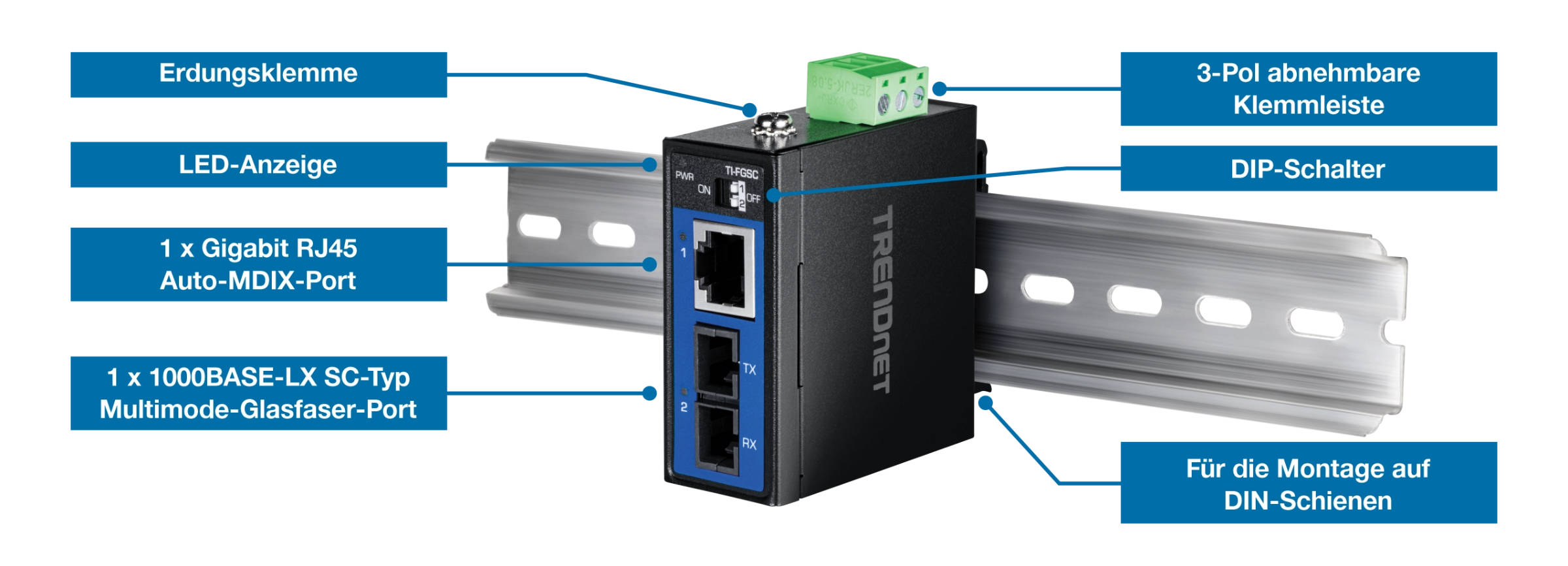 Der TI-FGSC verfügt über ein IP50-zertifiziertes Metallgehäuse, wodurch er für raue Umgebungen geeignet ist. Er integriert die 1000BASE-LX-Technologie mit einer Wellenlänge von 1310 nm und ermöglicht so stabile Gigabit-Übertragungen über Multimode-Glasfaser bis zu einer Entfernung von einem Kilometer – ideal für Verbindungen zwischen Gebäuden und lange industrielle Strecken.