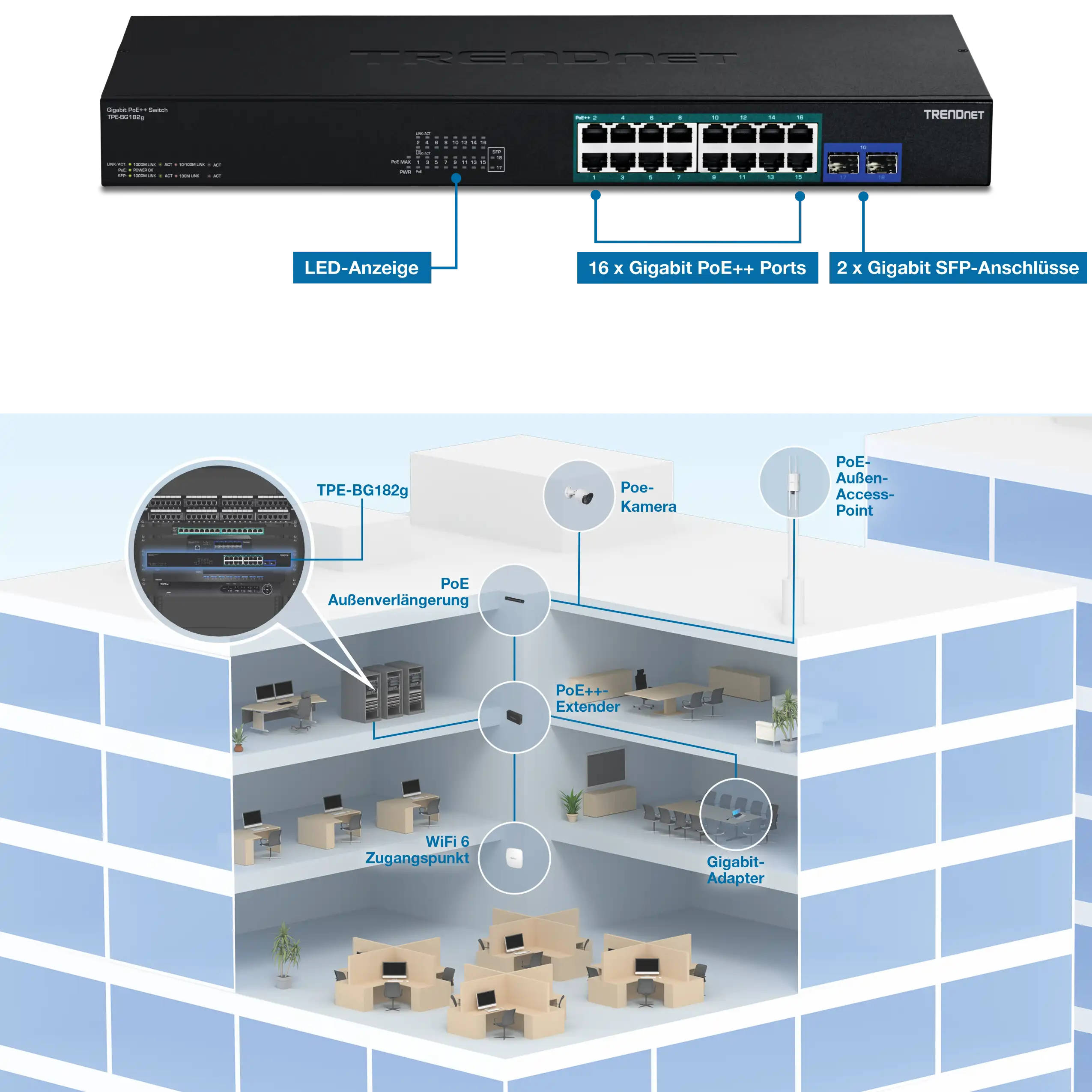 Der TPE-BG182g bietet flexible Einsatzmöglichkeiten, die von herkömmlichen Ethernet-Installationen bis hin zu umfangreichen Glasfaserverbindungen über größere Entfernungen reichen. Die Fähigkeit des Switches, eine Vielzahl von Geräten mit hohem Stromverbrauch zu unterstützen, wie z. B. High-End-WLAN-Access-Points, Überwachungskameras und Digital Signage, macht ihn zu einer idealen Lösung für moderne Netzwerkinfrastrukturen.
