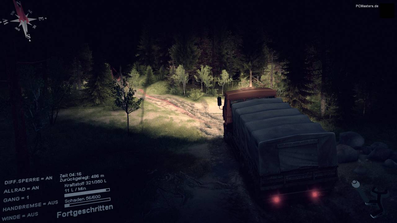 Deshalb sollte das Gefährt besser nicht umkippen, denn dann kann der Truck nicht mehr gestartet werden, die Winde funktioniert aber nur bei laufendem Motor, sodass ihr euch aus eigener Kraft nicht mehr retten könnt, außer ihr spielt im leichteren der beiden Modi, bei dem ihr euch jederzeit in die Garage retten könnt, weniger Benzin verbraucht wird, die Zeit (z.B. Nacht) übersprungen werden kann (auf Kosten von Benzin), die Navigation im Spiel und nicht nur auf der Karte sichtbar ist und das Differenzial auch bei Automatik-Schaltung aktiviert werden kann.