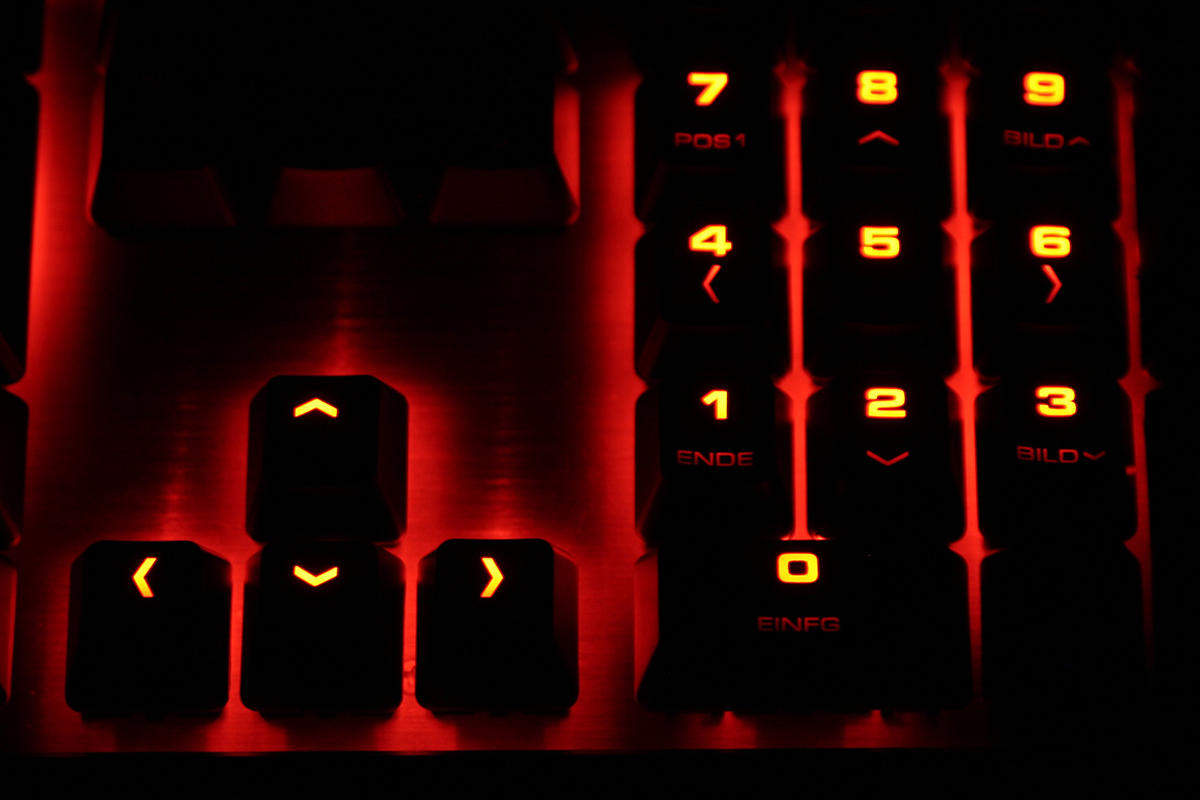 Einziger Kritikpunkt zur ansonsten gelungenen Beleuchtung ist, dass die Zahlenreihe etwas schwach beleuchtet ist. Dies ist der Tatsache geschuldet, dass die LEDs unter den Tasten jeweils im oberen Bereich angebracht sind, sodass an die untere Tastenbeschriftung weniger Licht gelangt.