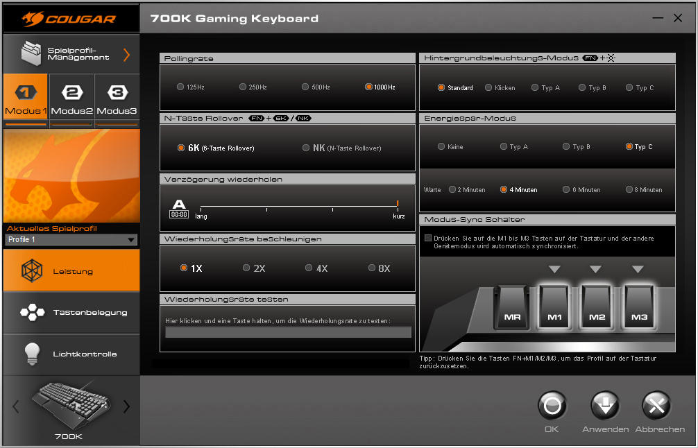 COUGAR 700K (NKRO, 6KRO) (Bild © ) Die Tastatur unterstützt N-Key Rollover, d.h. es gibt keine Einschränkungen hinsichtlich der Anzahl gleichzeitig drückbarer Tasten. Dies funktioniert auch im USB-Betrieb und kann auf Wunsch auf 6KRO umgestellt werden. Mit der COUGAR 700K ist man also für Anwendungen, die komplexeste Tastenkombinationen erfordern, gerüstet.