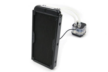 Der aus Aluminium gefertigte Radiator bildet auf Grund des Kostendrucks nicht das Highlight dieser AIO-Lösung. Immerhin hat man sich aber für ein 240er Modell entschieden, sodass die Wärmeabfuhr an die Umgebungsluft deutlich besser von statten geht als bei kleineren Varianten und die gesamte Wasserkühlung folglich einige Reserven mitbringt. Zudem ist die Verarbeitung für diese Preisklasse absolut OK. Beim Ausgangsmaterial handelt es sich wie anzunehmen aber lediglich um Aluminium. Wer hier ein hochwertigeres Fabrikat benötigt muss einfach deutlich tiefer in die Tasche greifen. Rundum passt der Wärmetauscher aber gut in diese AIO-Wasserkühlung von Raijintek.