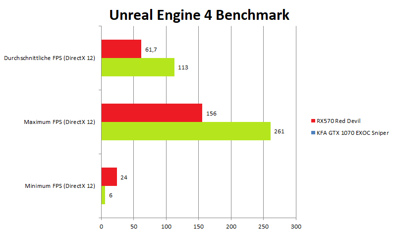 KFA2 GeForce GTX 1070 EXOC Sniper UnrealEngine4-DirectX12 (Bild © PCMasters.de)Auch die Tests mit der Unreal Engine 4 dominiert die GTX 1070, während man der RX 570 gute Werte attestieren muss, ist die GTX 1070 klar überlegen. Insbesondere wenn DirectX 12 ins Spiel kommt liegt eine nahezu doppelte durchschnittliche Framerate vor.