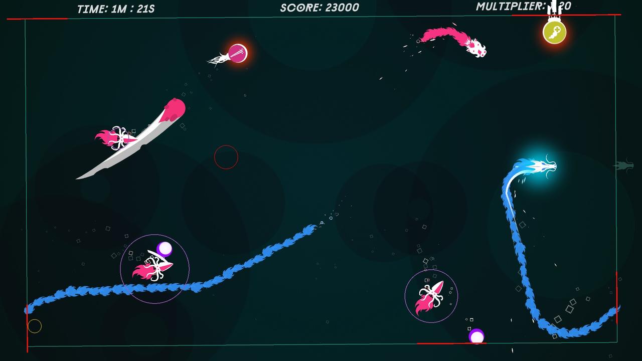 Wie man es früher von diversen Snake-Interpretationen kannte, können die Kites durch den nach und nahc kleiner werdenden Rand des Spielfelds fliegen und kommen dann auf der gegenüberliegenden Seite wieder zurück ins Spiel. Man muss also immer den Weg voraus planen und aufpassen dass man bei einem Ausweichmanöver nicht in eine andere Falle gerät.
