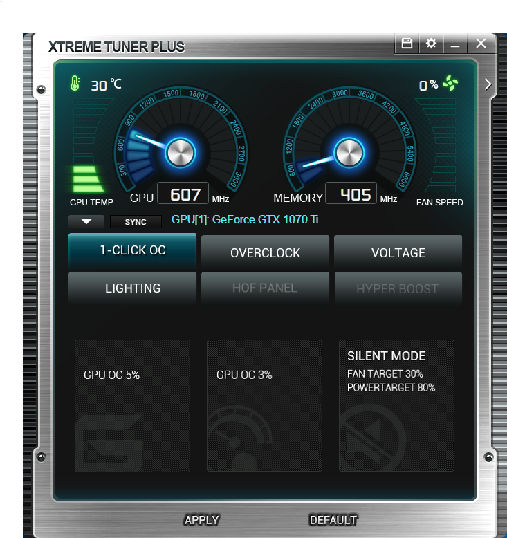 Die Software gibt auch Informationen zum Takt und Temperaturen der Karte. Die Spannungen und Taktraten können bei Bedarf auch angepasst werden. Wer ohne großes Risiko etwas Übertaktung wünscht, kann in Reiter „1-Click OC“ die Karte um 5% oder 3% übertakten. Auch ein besonders leiser Betrieb wird hier eingeschaltet. Das Tool ist hilfreich und für alle Nutzer empfehlenswert.