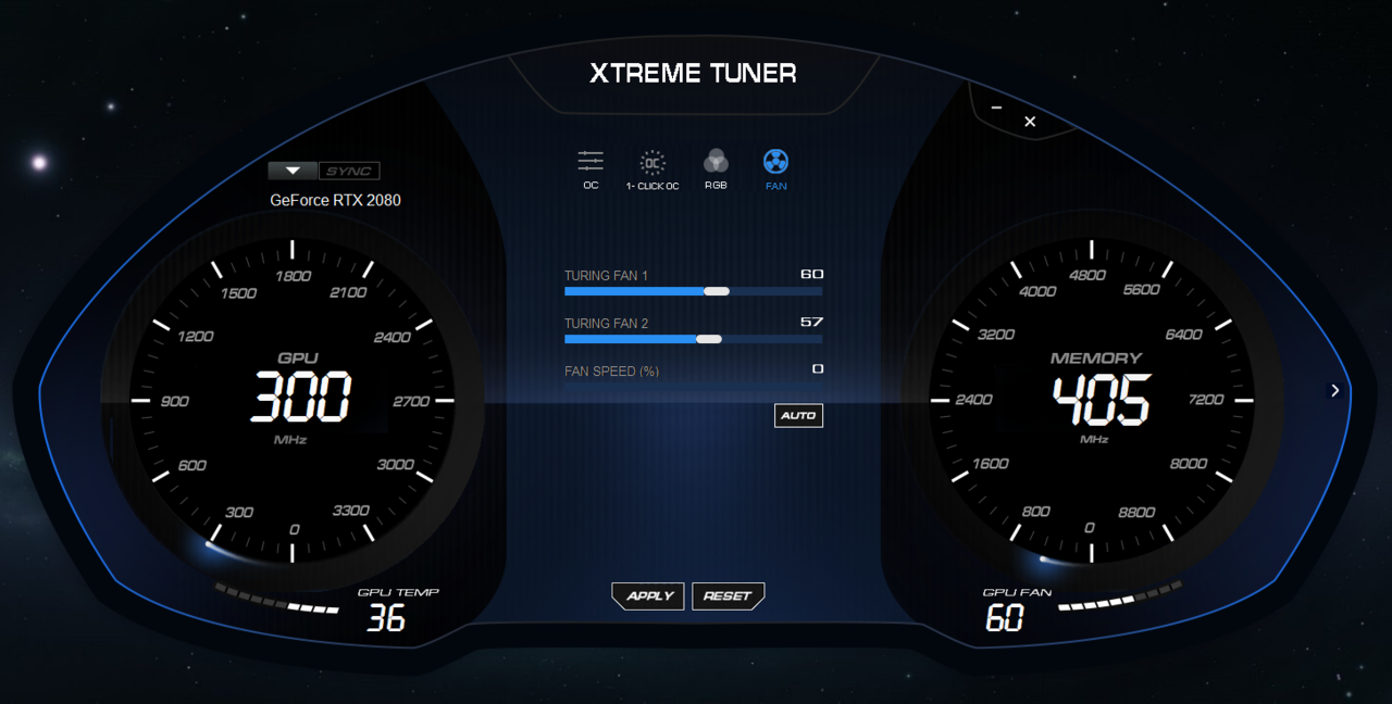 Das Xtreme Tuner Plus Tool von KFA2 war bei der RTX 2070 noch nicht so ausgereift. Bei unserem Test haben wir eine neuen BETA Version benutzt, in der auch bei den RTX20-Grafikkarten die 1-Click-OC Funktion integriert war. Mit dieser konnte man in der alten Version seine Grafikkarte zwischen 3 und 5% übertakten. In der neuen Version ist der OC-Scanner ganz rausgeflogen und stattdessen kann mit dem 1-Click-OC-Knopf die Karte um 45 MHz (2,6%) von 1.710 auf 1.755 MHz übertakten. Das ist ein nettes Feature, berücksichtigt aber leider nicht den GDDR6-Speichertakt.