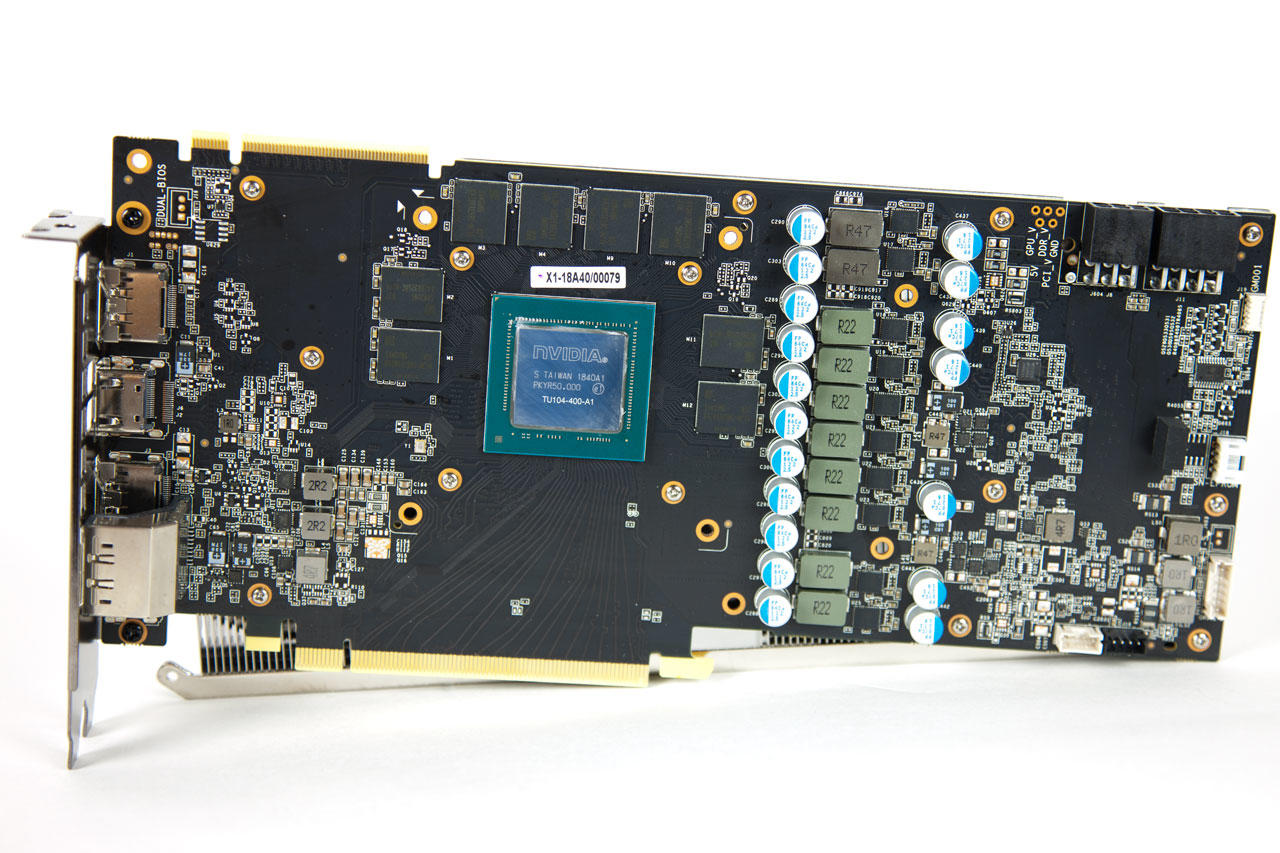 Das Herzstück der KFA2 GeForce RTX 2080 EX ist der Turing Chip, der aus 13,6 Milliarden Transistoren besteht. Genauer gesagt ist es der TU104-400-A1. Dieser bietet 2.944 Cuda Kerne (ALUs) und 184 Textureinheiten. Für die namensgebenden Raytracing Berechnungen stehen 46 RT-Kerne bereit und für DLSS 368 Tensor-Kerne. Bei den Taktraten hält sich KFA2 an die Vorgaben von Nvidia und belässt den Basistakt bei 1.515 MHz und Boost-Takt bei 1.710 MHz. Über das Overclocking-Tool von KFA2 kann man mit einem Klick die Karte auf 1.755 MHz übertakten - mehr dazu im Übertaktungsteil unseres Tests.