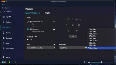 In der Software Sound Blaster Command kann man auf Wunsch diverse Equilizer und Modi auf den eigenen Geschmack anpassen. Auch Mikro-Einstellungen sind hier zu finden. Firmware-Updates der Soundkarte kann man auch nur hier durchführen. In der aktiven Testphase von über zwei Monaten hatten wir zweimal die Firmware aktualisiert. Unter Playback kann man die Bitrate und Filter einstellen. Dazu kann man die Lautsprecher hier konfigurieren.