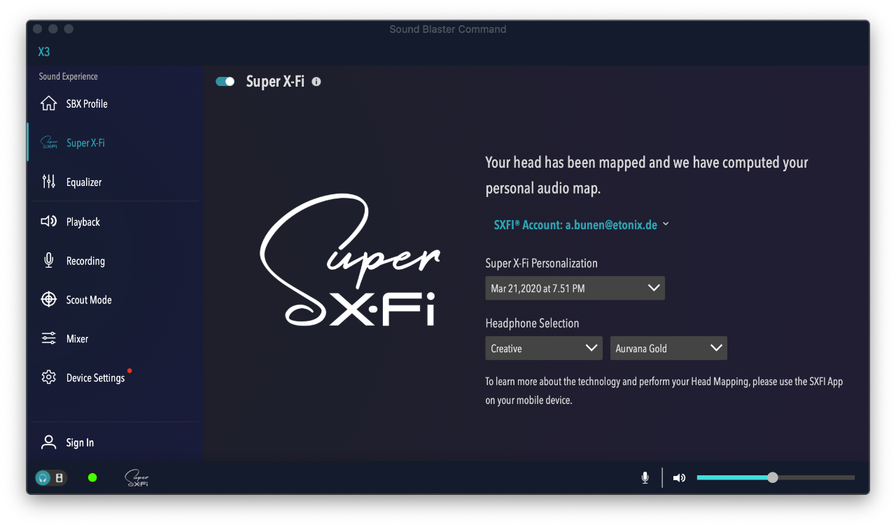 Die personalisierte Soundoptimierung des Raumklangs kann über das Smartphone mittels einer App vorgenommen werden. Dafür meldet man sich in der App an, dann wird das rechte Ohr, die Gesichtsfront und das linke Ohr "gescannt". Die Form und Größe soll dann zur Optimierung genutzt werden. In der Sound Blaster Command Desktop-App wird das Profil herunter geladen und anschließend auf die Sound Blaster X3 geladen.