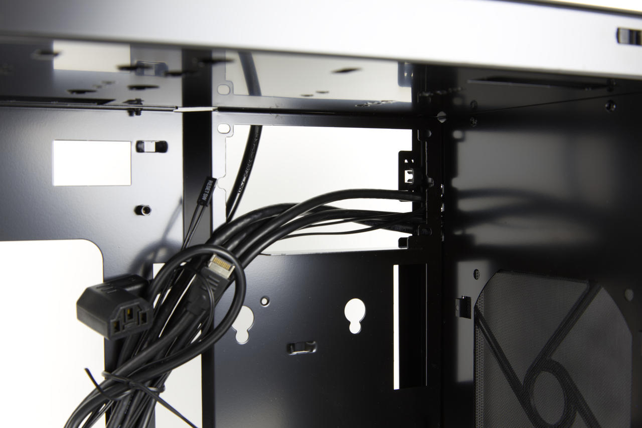 Bei der Wahl von Komponenten wird man nicht eingeschränkt und durch das 23,75 Liter Volumen hat man ordentlich Platz im Inneren. Beim Kabelmanagement gibt es wenig zu bemängeln, nur dass die Öffnung im Schlitten etwas größer sein könnte. Ansonsten passte alles gut, vor allem die Möglichkeit die Kabel oben im Deckel noch zu verlegen.