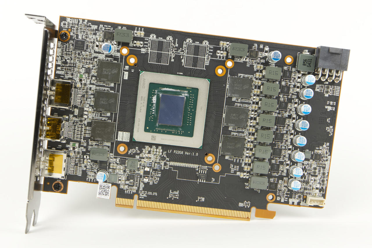 Die Karte soll laut AMD-Referenz eine TDP von 160 Watt erreichen. Gespeist wird sie über nur einen zusätzlichen 8-pin-PCIe-Stromstecker. Bei einem Blick auf das PCB, sieht man den Stromversorgungsaufbau mit sieben Phasen mit DA21232 Mosfets und vier weitere mit ON Semiconductor NCP302045 (0AA193B) Mosfets, die wohl für den GDDR6 Speicher genutzt werden. Von acht möglichen GDDR6-Chips sind sechs verbaut worden. Bei den Chips greift PowerColor zu Micron Chips mit der Bezeichnung 9YA77 D9WCW.