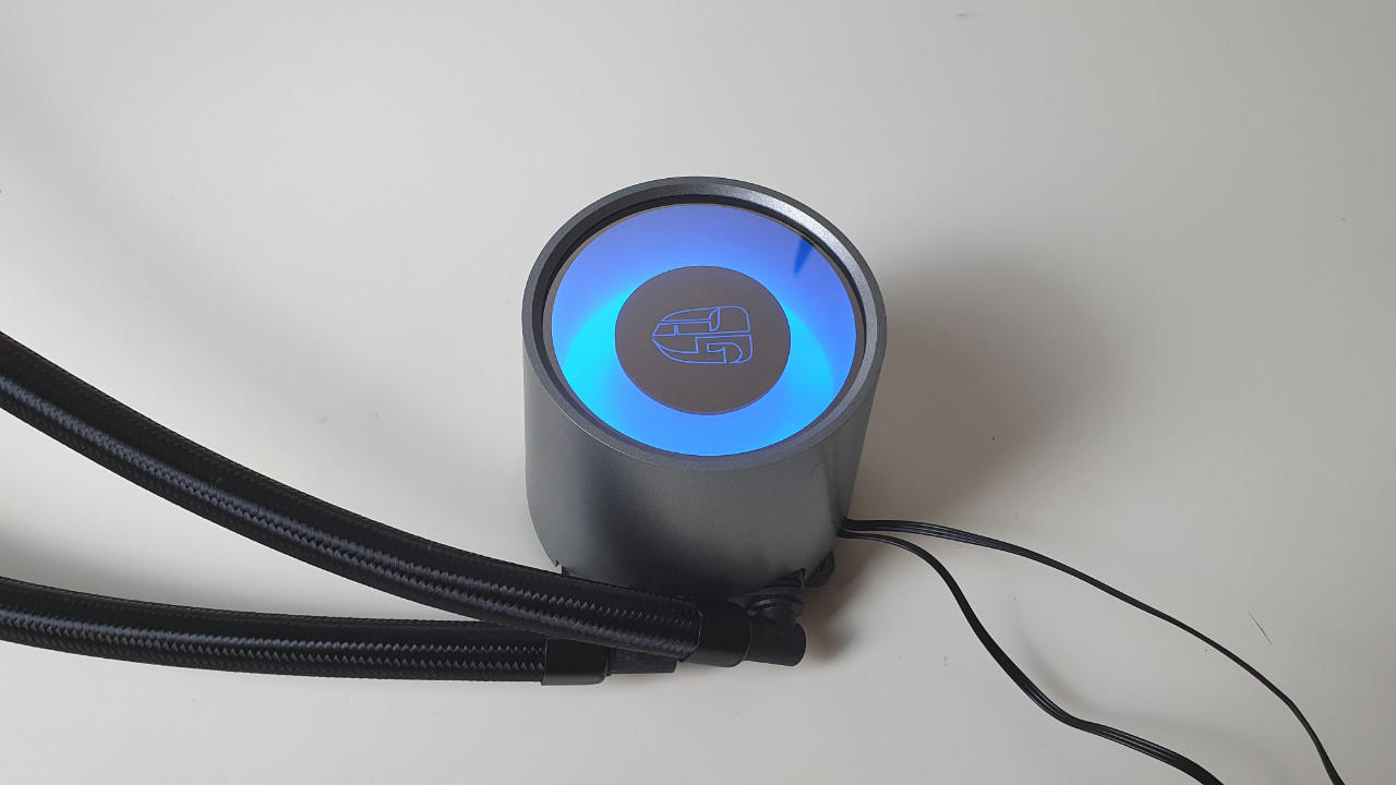 Der Kühlkörper besteht aus Kupfer, wie es bei hochpreisigen Kühlern üblich ist. Auf diesem befindet sich die Pumpe, welche mit einem Kunststoffgehäuse verdeckt wird. Das Gehäuse ist grau und kegelförmig. Vermutlich soll es an ein Schloss erinnern. In der Mitte des Kegels befindet sich das Castle-Logo, welches von der RGB-Beleuchtung im Hintergrund in Szene gesetzt wird. Besonders auffällig daran ist, dass der Kühler aufgrund des Kegels deutlich höher ist, als es bei AIOs üblich ist. Das hat vermutlich weniger mit einem technischen Hintergrund zu tun, sondern soll vermutlich der Optik dienen.