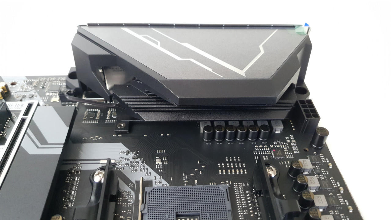Die Blende wird mit insgesamt vier Schrauben zusammen mit dem IO-Shield gehalten. Ein kurzes, unauffälliges Kabel verbindet die RGB-Beleuchtung mit dem Mainboard. Unterhalb der Blende ist der Kühler für die Spannungswandler zu finden. Dieser wirkt, als hätte Biostar hier den Standardkühler genommen und eine Etage draufgesetzt. Das erhöht natürlich die Kühlleistung und erklärt zugleich das hohe Gewicht. Der Kühler ist mit zwei Schrauben montiert und lässt sich einfach entfernen. Bei günstigeren Boards wird dieser mit einer Kunststoffhalterung befestigt und sollte nicht abmontiert werden. Eine solche Variante neigt auch zu einer schlechten Haftung. Im Gegensatz zu diesem Kühler, der sitzt bombenfest. Erst mal entfernt, stellen wir fest, dass ein dunkelgraues Wärmeleitpad verwendet wurde. Also wurde auch im Detail auf die Optik geachtet.