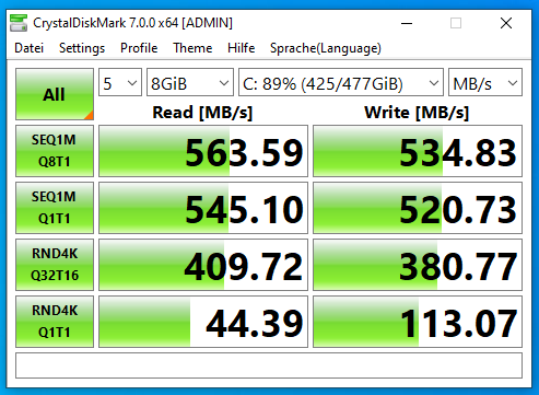 Als Sata-SSD wird eine Samsung SSD 860 PRO in der 512 Gigabyte Variante genutzt. Wie in dem Bild zu sehen ist, erreichen wir hier auch sehr gute Datenraten. Die Temperatur der SSD wird in unserem Test vernachlässigt, da diese nicht durch einen Kühler des Mainboards gekühlt wird.