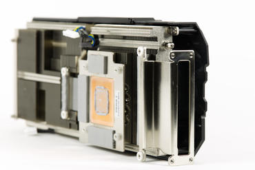 Der Kühler besteht essenziell aus zwei Kühlblöcken, von denen der eine über 3 Kupfer-Heatpipes versorgt wird und der über der GPU liegt auf der Base und die Heatpipes gehen hier in die Lamellen und die Base rein. Für diesen zweiten Lamellenblock ist eine weitere u-förmige Heatpipe eingelassen, die die Abwärme noch besser verteilen soll.
