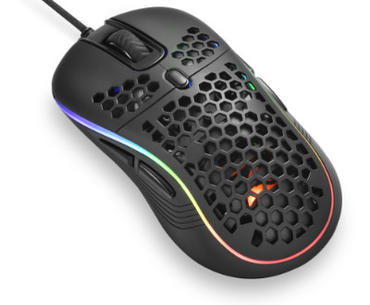 Bei der Sharkoon Light² S fällt neben der RGB - Beleuchtung auch das wabenförmige Design ins Auge, dies soll Schweißbildung verhindern, den Grip erhöhen und nebenbei auch noch Gewicht und Material sparen. Die Maus liegt gut in der Hand und gefällt uns auf Anhieb. Die gesamte Maus ist symmetrisch aufgebaut und ist eine der wenigen Mäuse, bei denen beide Daumentasten sowohl für Links- als auch Rechtshänder zugänglich sind. Man kann sogar mit etwas Eingewöhnung die Tasten auf der gegenüberliegenden Seite mit dem Ringfinger bedienen. Die Daumentasten sind fast perfekt auf die Daumenlänge unseres Testers angepasst, so dass beide Tasten uneingeschränkt benutzt werden können, ohne sich zu verbiegen, da hatten wir schon andere Kandidaten, bei denen nur eine Taste gut bedienbar war. Der Druckpunkt der Daumentasten ist spürbar, hätte jedoch noch etwas knackiger von Statten gehen dürfen.