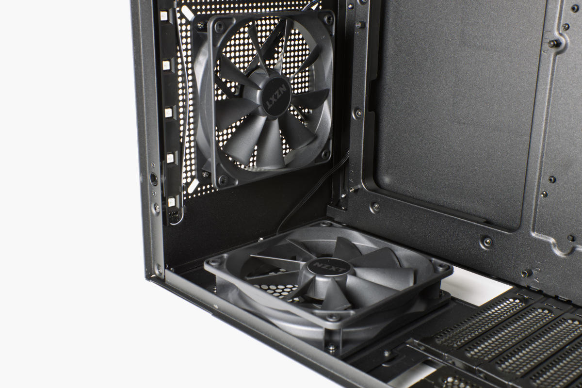 Auch bei der Kühlung sollte es keine Abstriche geben und so verbaut NZXT zwei Axiallüfter der eigenen Aer F-120-mm-Lüfter. Der erste befindet sich im Heck und der zweite oben im Gehäuse. Beide sind so angebracht, dass sie die Luft nach außen befördern und so für einen Sog sorgen. Die Luft kann von unten oder der Front angesaugt werden. Hier befinden sich Mesh-Lufteinlässe, die mit Staubfiltern versehen sind. In der Front ist dieser im Stahlseitenteil und auf gleicher Höhe unten zu finden.