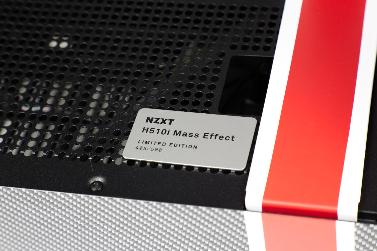 Ein sehr auffälliges Element findet man auf der Abtrennwand, da hier neben der roten Linie ein Metallemblem angebracht ist. Dieses ist nicht hundertprozentig gerade geklebt worden, was jedoch nicht besonders auffällt. Auf dem Emblem findet man die Lotnummer des H510i Mass Effect, da es sich hier um eine Limited Edition handelt. Unser Exemplar ist die Nummer 405 von 500. Daraus geht hervor, dass es weltweit nur 500 Stück gibt, was das Gehäuse noch einmal einzigartiger macht.
