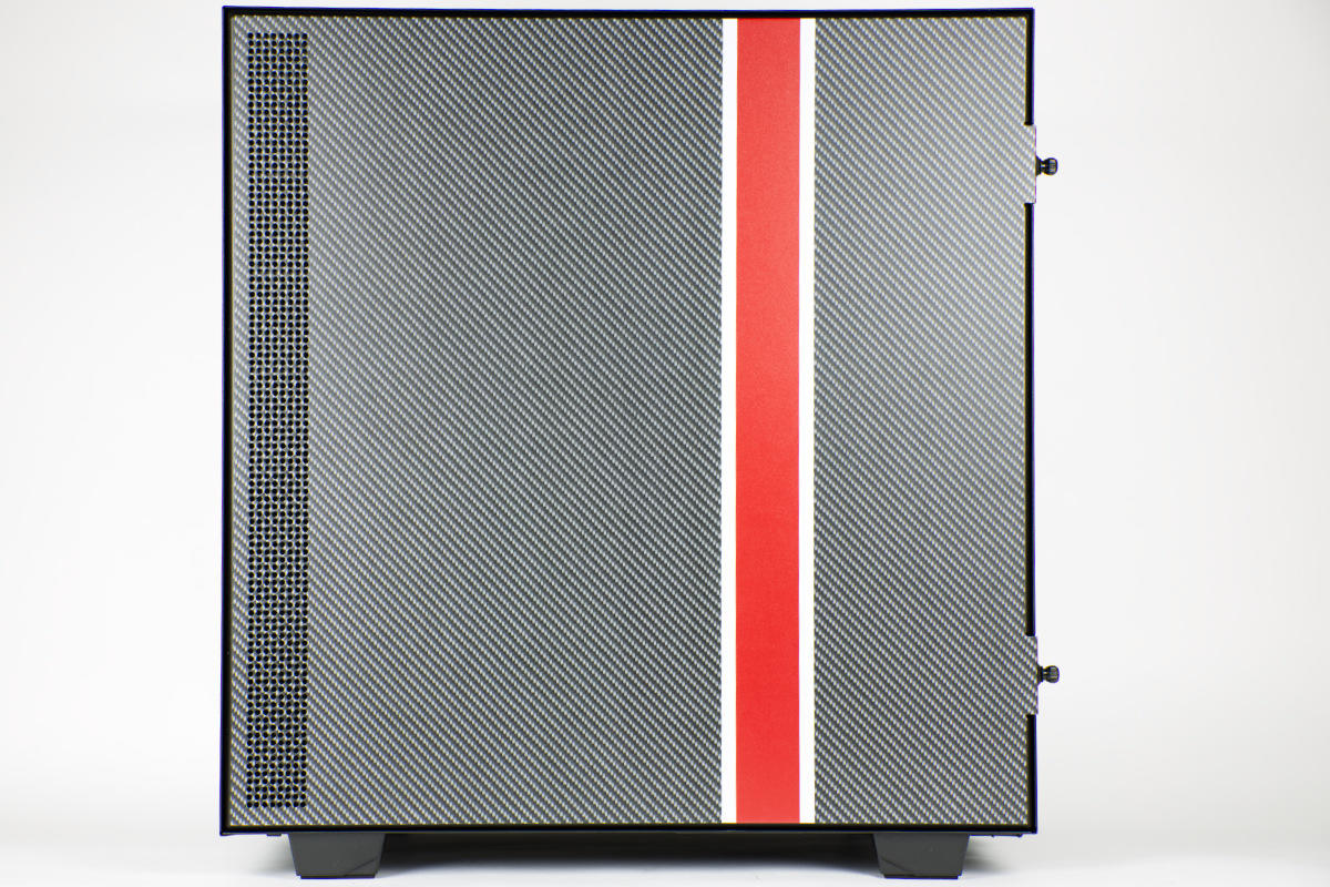 Nachdem man die Basis kennt, kann man besser beleuchten, was nun an der H510i Mass Effect Limited Edition anders ist. Ganz klar fällt als erstes das neue Äußere auf. Die Stahlseitenteile sind mit einem Carbon-Muster beklebt, was erstaunlich echt aussieht. Natürlich handelt es sich hierbei nicht um echtes Carbon, weil die Panel in solch einer Größe richtig teuer sind und für das Gehäuse nicht unbedingt vorteilhaft wären. Warum es gerade ein Carbon-Look sein musste, mag sich der ein oder andere fragen. Das gesamte Design des H510i Mass Effect ist im Grunde an den N7 Carbon-Armor von Sheppard aus Mass Effect 2 angelehnt, der ebenfalls mit roten-weißen Linien verzeirt war. Das Gehäuse soll sozusagen die epische Rüstung für den eigenen Gaming-PC sein.