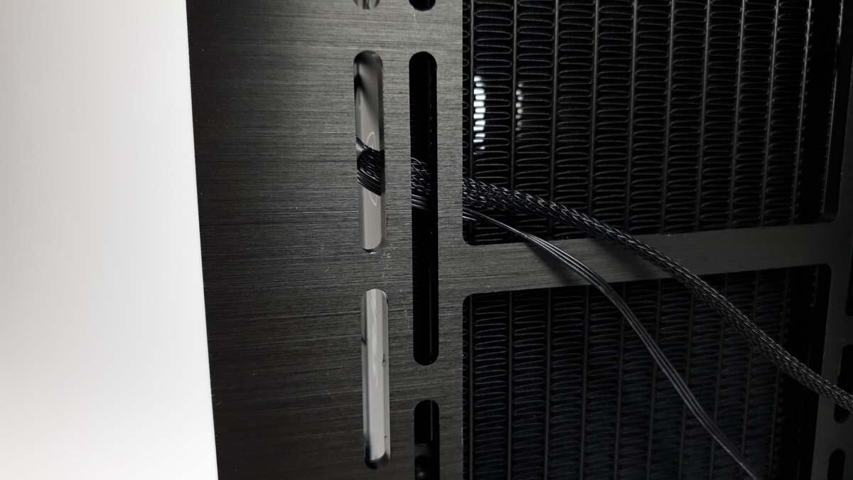 In der Mitte befinden sich zwei größere Kabeldurchführungen. Diese sind mit einer Gummiabdeckung versehen, damit diese nicht so ins Auge stechen. Das ist bei hochwertigeren Gehäusen Standard. Aus unserer Sicht für die Optik auch sehr sinnvoll.