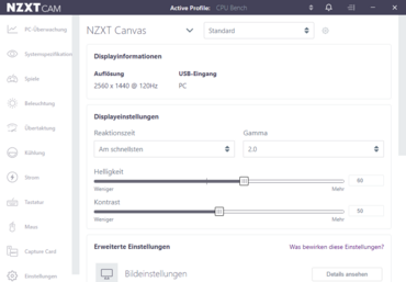 So ist das auch bei dem Canvas Monitor nicht anders. Während der Testphase konnten wir keinen eigenen Reiter für den Monitor finden, jedoch war es möglich in der Software unter Einstellungen auf Profile Sync zu gehen, wo man alle Controller vorfindet. Über einen Klick auf den Pfelin links vom Canvas Monitor kommt man dann in die Einstellungen des Monitors. Es ist dabei eher überraschend, dass man alle Einstellungen, die man über den Monitor selbst regeln würde, dann in der CAM Software vornehmen kann.