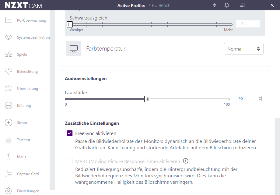 Ganz unten findet man die Option „FreeSync aktivierten“. Diese ist aktiviert und ist ein wichtiges Feature, das man nicht abschalten sollte. Wenn es bei bestimmten Spielen stört, kann man FreeSync ausmachen und stattdessen Moving Picture Response Time stattdessen aktivieren. Wir haben jedoch nur FreeSync verwendet.