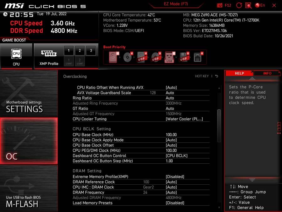 Unter dem Advanced Modus finden wir unter anderem auch den OC Bereich. Da das MSI MEG Z690 ACE über ein Z690 Chipsatz verfügt, können wir unsere CPU auch übertakteten. Die Spannung Versorgung ist ebenfalls mehr als großzügig ausgelegt und sollte hier keine Probleme bereiten. Da übertakten ist recht einfach gehalten. Wir können sowohl die P-Cores als auch die E-Cores übertakten. Dabei können wir entscheiden, ob wir alle gleichzeitig übertakten wollen oder jeden Kern einzeln einen Wert zuteilen möchten. Wir haben uns entschieden, drei der P-Cores auf 5,2 GHz laufen zu lassen. Der Rest bleibt auf Auto. Sofern die CPU genug zu tun hat und dabei kühl ist, werden diese mit 4,9 GHz laufen. Unser I7-12700K aus dem test ist hier der limitierende Faktor. Die CPU wird sehr heiß. Das auch schon ohne die Übertaktung. Das liegt daran, dass die Alderlake CPUs schon ab Werk nah an ihr Limit gebracht werden.