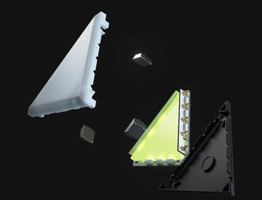 Die Dreiecke sehen auf den ersten Blick echt schick aus und deuten an, dass sie komplett ausgeleuchtet werden. Beim Einschalten merkt man, dass die Ecken nicht beleuchtet werden. Das milchige Plastik geht zwar komplett durch, aber das Licht der drei RGB-LEDs wird an den Ecken von den Magneten geblockt. Im Inneren wird ein jede Kante durch drei RGB-LEDs ausgeleuchtet. Das Ganze ergibt eine gleichmäßige Ausleuchtung des Dreieckes.