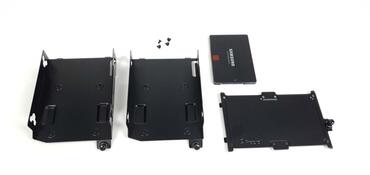 Für die beiden 3,5“ Schächte gibt es im unteren Raum des Gehäuses vier Plätze zur Befestigung. Sofern beide Schächte verbaut werden, müssen aber die jeweils äußersten Plätze genutzt werden. Die SSDs können sowohl in diesen beiden Schächten verbaut werden als auch in eine extra für die SSDs vorgesehene Halterung. Hier wird einfach die SSD auf die Metallplatte geschraubt und diese dann in das Gehäuse gesetzt und mittels Schraube arretiert.