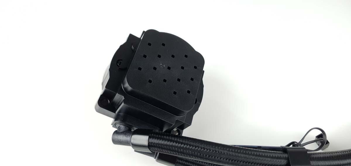 Der Kühlblock ist mit einer sehr ansehnlichen Würfelfassade umgeben. Davon ist ein Teil verspiegelt. Dieser Teil spiegelt mit einer silbernen Optik. Sobald die AIO eingeschaltet wird, ist auf diesem Spiegel ein sehr cooles RGB-Würfeldesign zu erkennen.