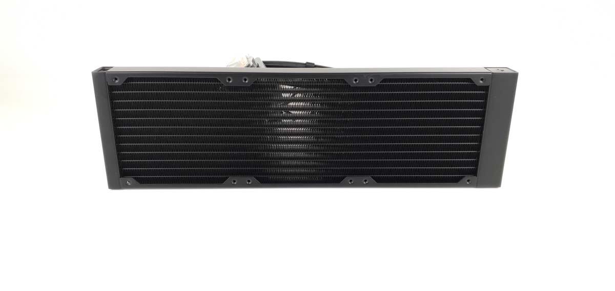 Die DeepCool LT720 verfüge über einen großen 360-mm-Radiator. Auf diesen finden drei 120-mm-Lüfter Platz. Die Pumpe befördert die erwärmte Kühlflüssigkeit durch den Radiator. In diesen wird dann die Hitze auf die Kühlfinnen übertragen. Die Kühlfinnen sorgen für eine möglichst hohe Oberfläche, welche dann die Hitze möglichst gut an die Umgebungsluft abgegeben wird. Um diesen Effekt zu verbessern, wird mit den Lüftern Luft zwischen den Finnen durchgepustet. Bei unserem Radiator sind ein Paar Kühlfinnen etwas verbeult. Das ist aber nicht weiter schlimm. Das kann je nach Postboten schon mal vorkommen. Damit der Einfluss auf die Kühlleistung nimmt, muss der Radiator aber grob demoliert sein. Der Radiator besteht aus Aluminium und ist mit schwarzem Lack überzogen. Für AIOs ist das quasi Standard, bei hochpreisigen Custom-Wasserkühlungen besteht die Radiatoren oft aus Kupfer. Welche die Wärme besser ableiten. In dem Preissegment ist das aber nicht möglich.