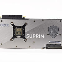 Auf der Rückseite befindet sich eine große Backplate, die im gleichen Alu-Look gehalten wird und auch aus Aluminium hergestellt ist. Die Backplate bedeckt fast die gesamte Rückseite und bietet kaum Öffnungen. Die Abwärme vom PCB wird an einigen Stellen mittels Wärmeleitpads an die Backplate übertragen. Auch hier findet man den MSI-Drachen, der in als Emblem recht groß auf der Backplate prangert.