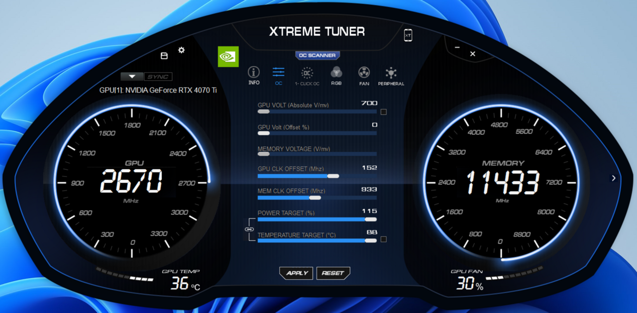 Der Chip wird von Nvidia bei TSMC im hochmodernen 4N-Prozess gefertigt. Die KFA2 GeForce RTX 4070 Ti arbeitet mit einem Basis-Chiptakt von 2.310 MHz und einem Boost von 2.670 MHz. Mit dem hauseigenen Tool XTremeTuner von KFA2 kann man den Boosttakt mit einem Klick auf 2.685 MHz erhöhen. Das ist keine große Steigerung und mit ein paar Handgriffen lässt sich auch mehr herausholen.