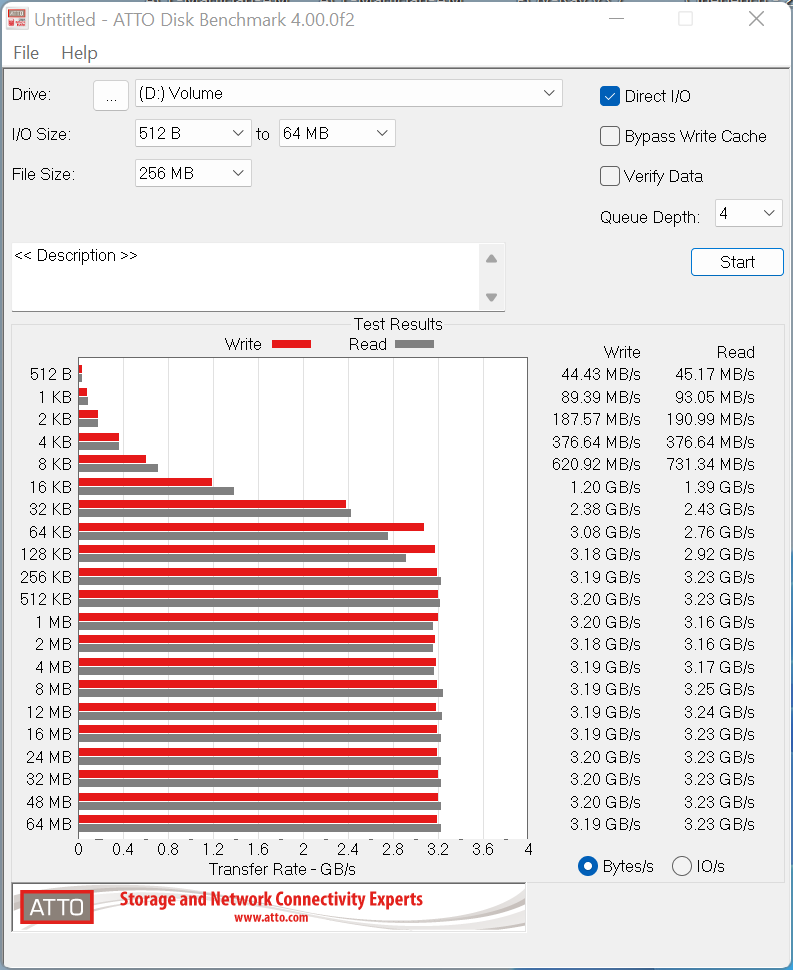 Im Vergleich dazu, schaffte die Sabrent NVMe-M.2-SSD 3,19 GB/s bei sequenziellem Schreib- und 3,23 GB/s sequenziellem Lesedurchsatz.