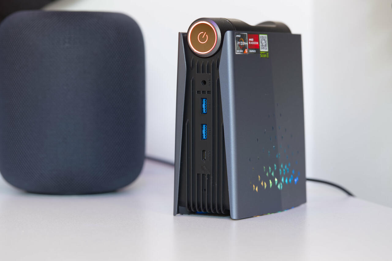 Zu den Vorteilen des AMR5 zählt, dass der MiniPC nicht nur kompakt ist, sondern auch gut aussieht und auch über eine ARGB-Beleuchtung verfügt. Dazu ist er gut verarbeitet. Über einen Schalter auf dem PC kann man sogar zwischen Silent-, Auto- und Performance-Modus schalten. Dann kann man den Betrieb des PCs beeinflussen und ihn leiser machen oder für höhere Leistung einstellen.
