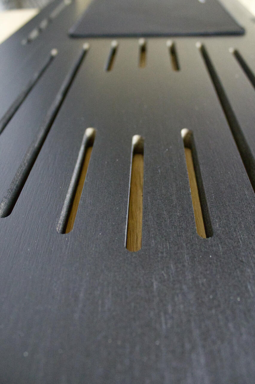 Die Auflage ist aus 100% nachhaltigem Bambus gefertigt und macht einen qualitativ sehr hochwertigen Eindruck, denn alle Ränder wurden sauber verarbeitet und auch die Farbe ist gleichmäßig aufgetragen worden und überzeugt in ihrer Optik. Der Schaumstoff ist nach dem Entfalten angenehm fest, aber nicht bock hart und auch nicht labberig weich, eigentlich der ideale Armschmeichler. Auch die schwarzen Kissenbezüge in ihrer Wildlederoptik wirken hervorragend im Zusammenspiel mit dem gesamten Produkt und geben dem Ganzen eine sehr hochwertige Materialanmutung.