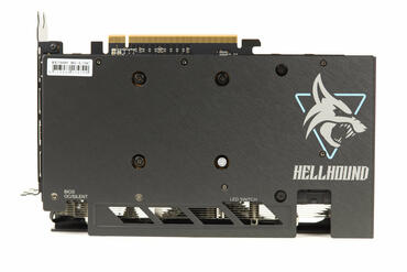 Die Hellhound-Serie wirkt immer etwas unauffälliger im Vergleich zur RedDevil-Reihe. Es ist interessant zu sehen, dass zwar das Zwei-Slot-Design eingeführt wurde, aber die Karte deutlich höher ist. Sie geht über den Slothöher hinaus. Die Front mit den Lüftern ist gut verarbeitet und die Abdeckung ist aus matt-schwarzem Plastik. Die Lüfter leuchten dabei und bedecken den Großteil des Kühlers.