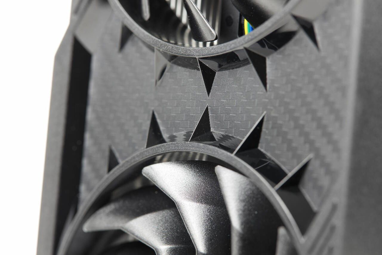 In dem Plastikrahmen sind zwei Axiallüfter mi 88-mm-Durchmesser platziert. Sie drehen im Idle-Betrieb kaum und so ist die Karte oft nicht hörbar. Bei Last drehen die Lüfter dann ab 60°C auf, arbeiten aber im Standardbetrieb recht leise.