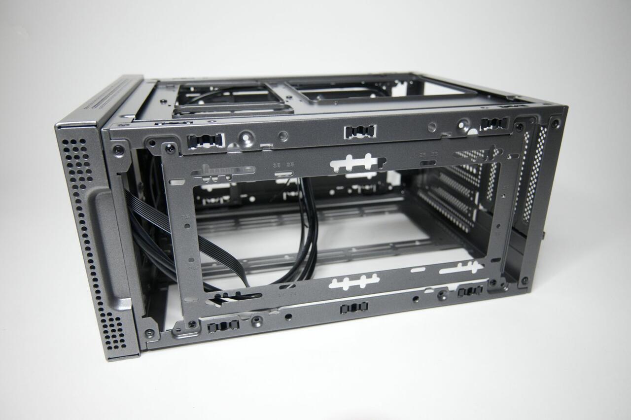 Im Gehäuse Inneren findet dann entweder ein Micro-ATX- oder ein ITX-Mainboard seinen Platz, für Grafikkarten stehen bei horizontalem Einbau mit SFX-Netzteil bis zu 335mm Länge zur Verfügung, mit montiertem ATX-Netzteil schrumpft der Stauraum auf eine Länge von 245mm zusammen.