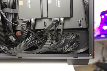 Nachdem wir die Kabel alle nacheinander angeschlossen und verteilt haben, war selbst der Anschluss der letzten SATA-Kabel ein Kinderspiel. Hinzu kommt, dass die Buchsen klein ausfallen – hier waren wir noch die großen Anschlüsse gewöhnt gewesen.