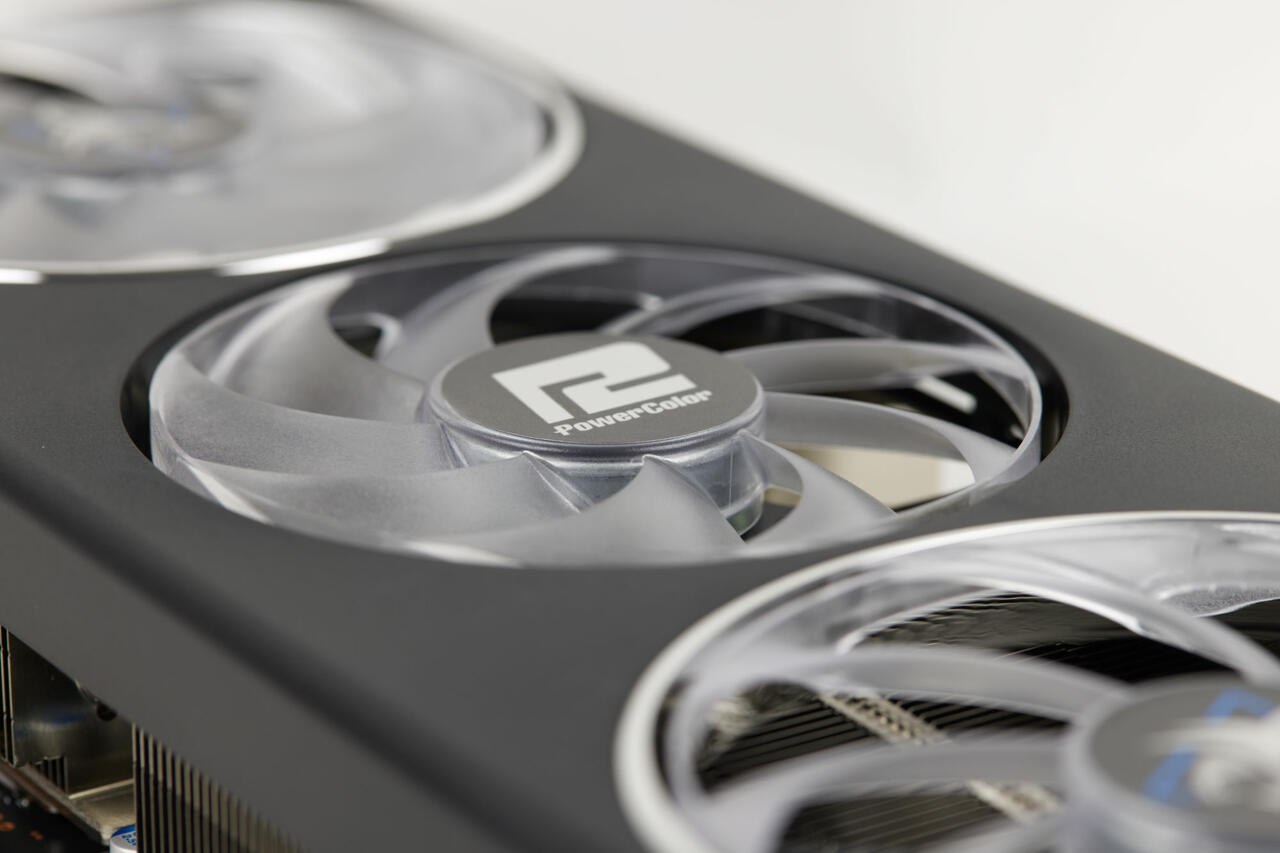Beim Kühler macht PowerColor alles richtig und so kann man sich maximal ARGB-Beleuchtung wünschen, weil hier minimalistishce Beleuchtung verwendet wird. Die Grafikkarte ist aber gut verarbeitet und weist keine Makel auf. Dazu ist sie unter Volllast mit nur 33,6 dBA wirklich angenehm leise!