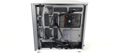 Von Haus aus sind in der Front drei große 140-mm-Lüfter installiert, diese drehen maximal mit 1.700 U/Min. Aufgrund des Mesh-Hecks kann die Luft einfach von vorne nach hinten getrieben werden, wo sie dann aus dem Gehäuse entweicht. Als kleine Besonderheit gibt es noch explizit vor der Grafikkarte eine Halterung für zwei 140-mm-Lüfter. Diese pusten frische Luft von der Seite direkt auf die Grafikkarte. Generell ist das eine gute Idee, bei großen Grafikkarten kann die Halterung aber im Weg sein. In dem Fall kann die Halterung aber einfach entnommen werden. Das Kabelmanagement wird mit einfachen Klettverschlüssen umgesetzt. Zusätzlich sind an den wichtigen Stellen einfache Ösen für Kabelbinder vorhanden.
