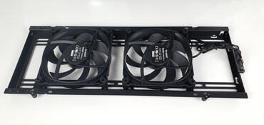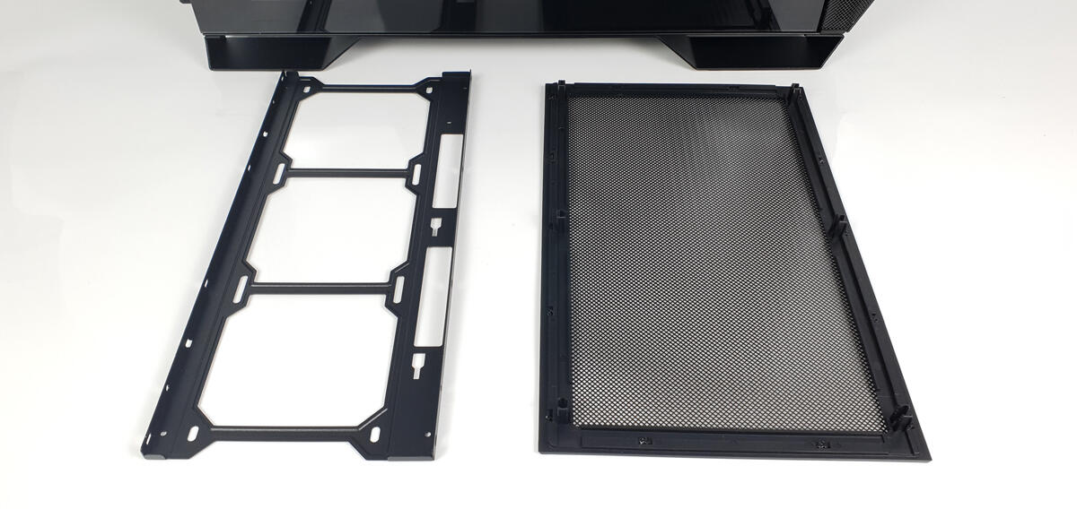 Das Kühlkonzept ist simpel gehalten. Vorne wird kühle Luft angesaugt und hinten wird warme Luft aus dem Gehäuse gedrückt. Dadurch entsteht ein Airflow von vorne nach hinten. Ab Werk sind vorne zwei 140-mm-Lüfter verbaut. Die Front ist größtenteils geschlossen. Aufgrund dessen muss vorne ein gewisser Unterdruck entstehen, damit die Lüfter mehr Frischluft bekommen. Da hier aber nur zwei Lüfter verbaut sind und oben noch sehr viel offener Platz vorhanden ist, schaffen zumindest die beiden Frontlüfter nicht den entsprechenden Unterdruck, da sie einfach wieder Luft aus dem Gehäuse zugeführt bekommen. Der Unterdruck wird hier größtenteils vom hinteren Lüfter erzeugt. Es ist also empfehlenswert, vorne einen weiteren 140-mm-Lüfter hinzuzufügen. Um dieses Problem zu beheben, liegt zusätzlich ein Mesh-Einsatz für das Frontpanel bei. Hier kann also jeder selbst entscheiden, ob er den Airflow benötigt oder lieber die Geräuschdämmung und das andere Design nutzt. Im Boden kann ebenfalls ein Lüfter verbaut werden. Damit die dort zugeführte Luft auch in die Hauptkammer gelangen kann, gibt es für die Bodenplatte in der Hauptkammer ein austauschbares Bodenteil. Im Bild ist das vor dem unteren vorderen Lüfter zu sehen. Zusätzlich können in der Seite noch drei 120-mm-Lüfter verbaut werden. Dazu müssen die im Bild zu sehenden Blenden entfernt werden. Außerdem ist unter dem Deckel noch Platz für weitere drei 140-mm-Lüfter. Dazu muss, wie oben bereits beschrieben, die Dämmung aus dem Deckel entnommen werden.