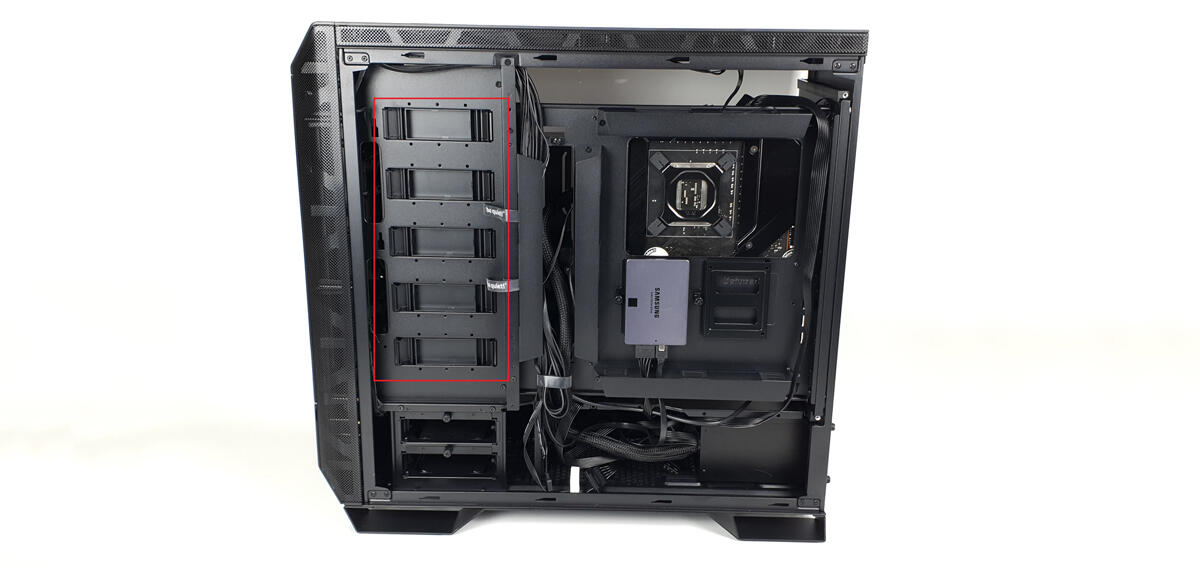 Zum Verbauen der 2,5-Zoll-Festplatten gibt es zwei kleine Stahlrahmen. Auf diese werden die SSDs einfach angeschraubt. Anschließend werden die SSDs samt des Stahlrahmens einfach mit der rechten Seite in das Gehäuse gehakt und auf der linken Seite festgeschraubt. Die Stahlrahmen sind sehr hochwertig verarbeitet, sobald diese festgeschraubt sind, klappert dort nichts mehr. Für die Kabel der SSDs gibt es extra eine Kabeldurchführung. Das ist sehr schön gemacht.