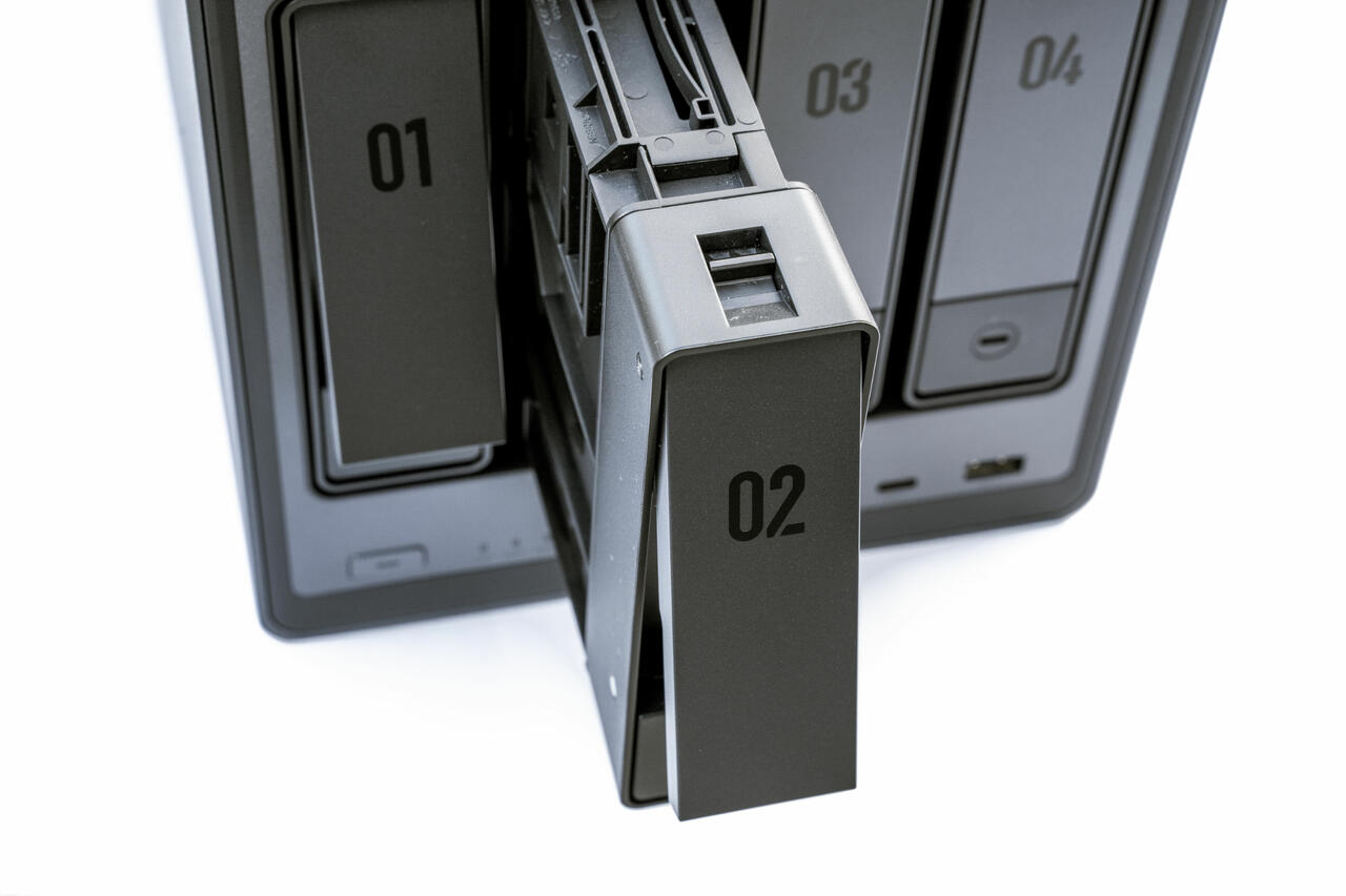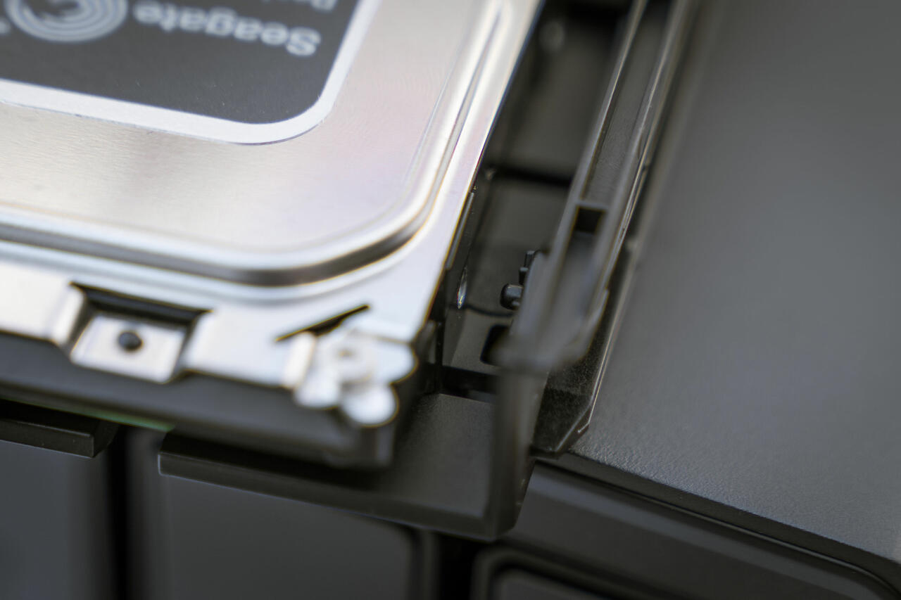 Bis zu vier normalen Festplatten lassen sich beim DXP4800 Plus installieren. In unserem Testsystem haben wir uns aber entschieden, erstmal nur eine einzelne Seagate Festplatte zum Einsatz zu bringen. Am Ende spielt es keine Rolle, und natürlich werden alle möglichen Raid-Konfigurationen unterstützt.