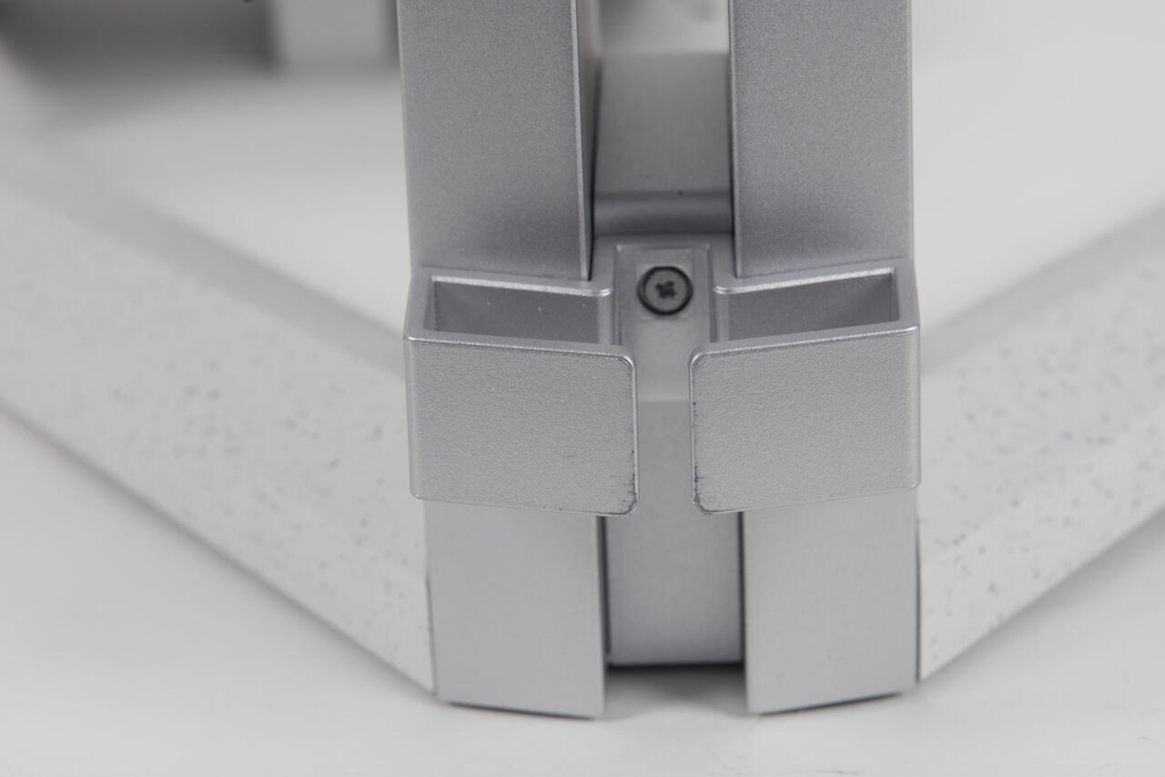 Der Fuß besteht aus zwei Teilen, wobei man den unteren V-förmigen Teil in den anderen reinsteckt. Danach schraubt man nur noch die Schraube unten fest, damit der Standfuß bereit ist.