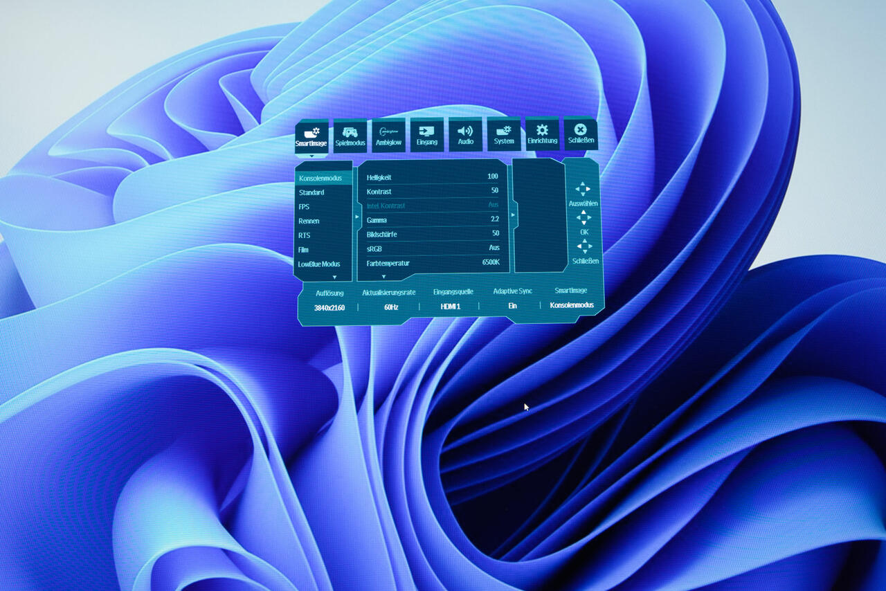 Die Einstellungen des Monitors erfolgen über das OSD-Overlay-Menu, wie bei fast allen Monitoren. Es gibt hierfür nur einen Joystick. Beim Klicken auf den Joystick schaltet man den Monitor an oder aus.