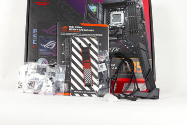Im Inneren folgt das Zubehörpaket dem typischen Ansatz der ROG-STRIX-Serie bietet viele Extras, wie Aufkleber. Neben der Wi-Fi 7-Antenne bietet ASUS zwei SATA-Kabel und ein Benutzerhandbuch.
