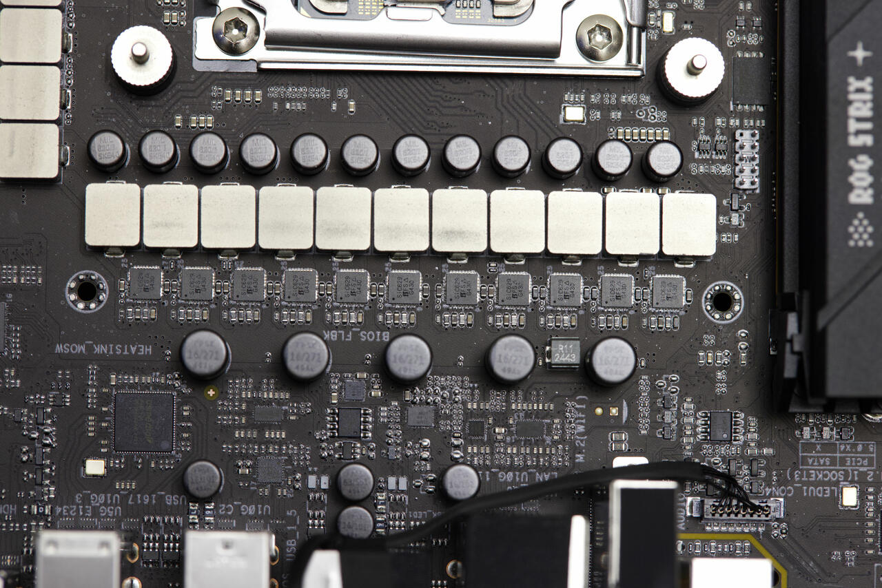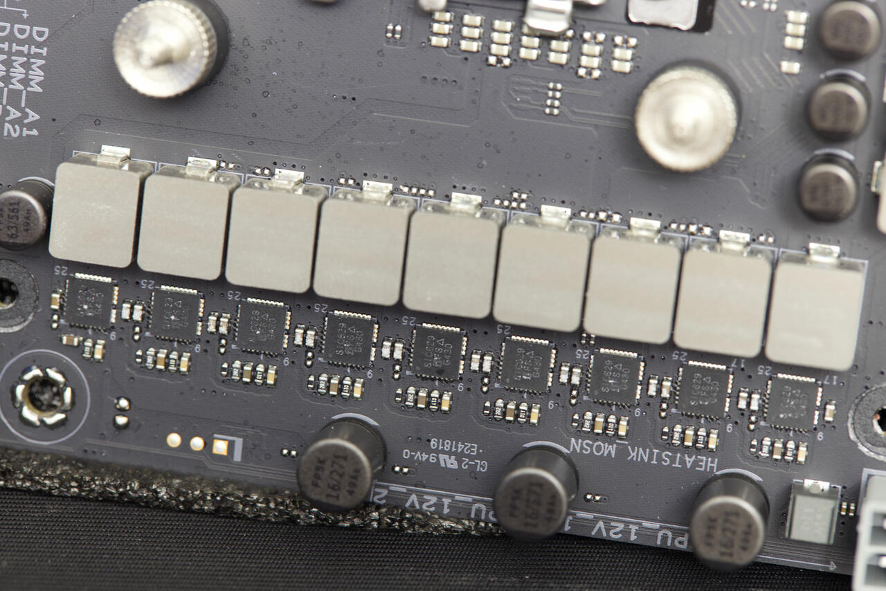 Das Herzstück dieses Designs ist ein mehrphasiges Stromversorgungssystem, das darauf ausgerichtet ist, Spannungswelligkeit und transiente Spitzen zu reduzieren. Mit 16 Leistungsstufen für die CPU (VCORE) und weiteren zwei Leistungsstufen für VSOC verteilt das Board die Leistung gleichmäßig und entlastet so die einzelnen Komponenten. Diese Architektur umfasst ein Dr.MOS-Design, das bis zu 80 A unterstützt und damit die Fähigkeit des Boards unter Beweis stellt, High-End-Prozessoren zu versorgen, ohne an Stabilität zu verlieren.